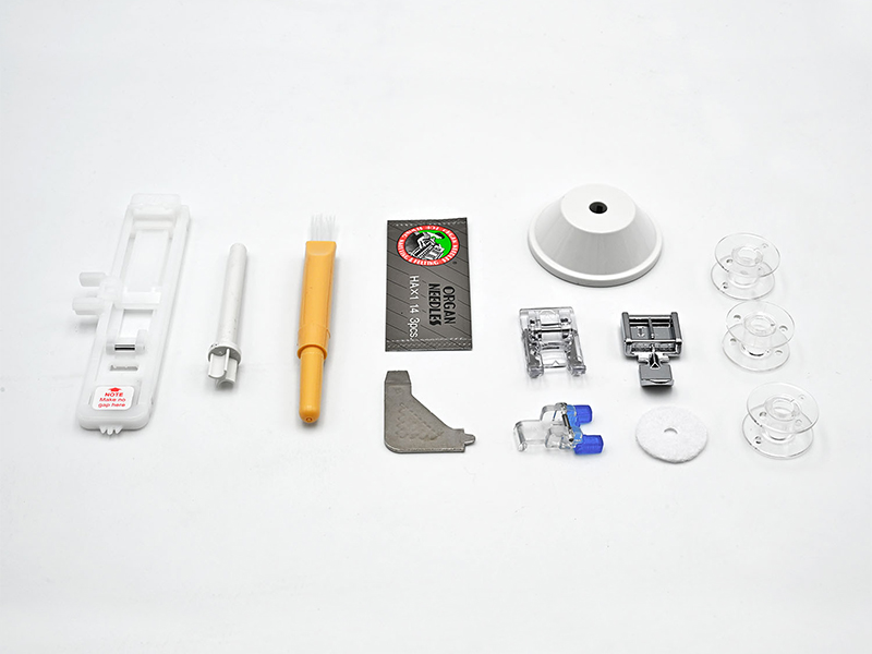 - Piedini (standard, per cerniere, per asole, per punto satin, per cucitura bottoni).
