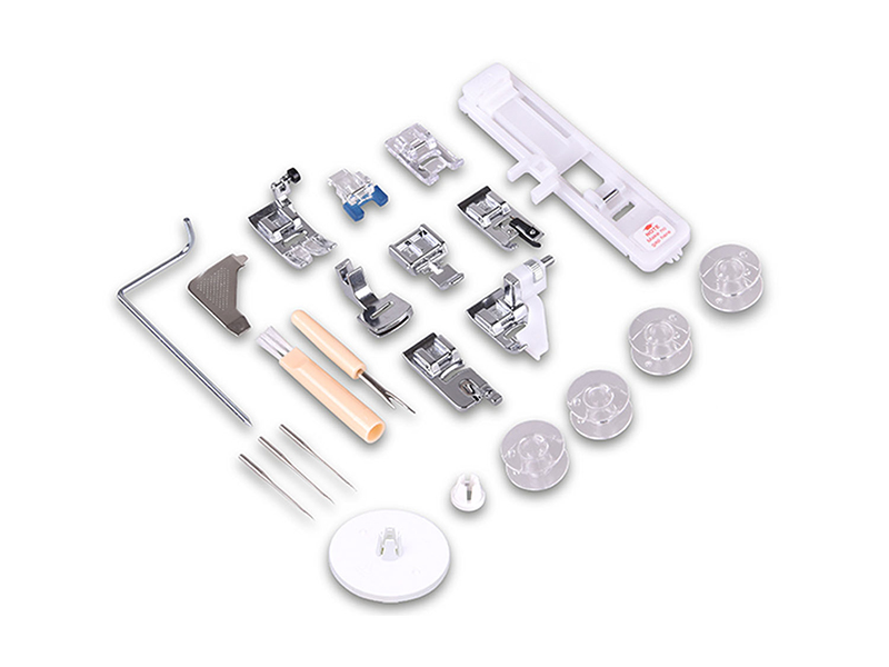 Piedino standard, Piedino per cerniere, Piedino per asole, Piedino per punto satin, Piedino per cucire bottoni, Piedino sopraggitto, Piedino orlo invisibile, Piedino orlo arrotolato, Piedino arricciatore, Guida bordo/trapunta, Apriasola/Scucitore/Spazzolina, Confezione di aghi (# 11, # 14, # 16), Fermaspola grande, Fermaspola piccolo, Spoline (4x), Cacciavite a L, Copertina morbida. Non contiene l’oliatore, ai sensi delle vigenti normative.