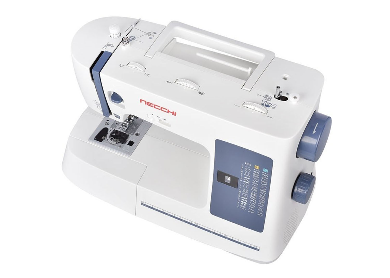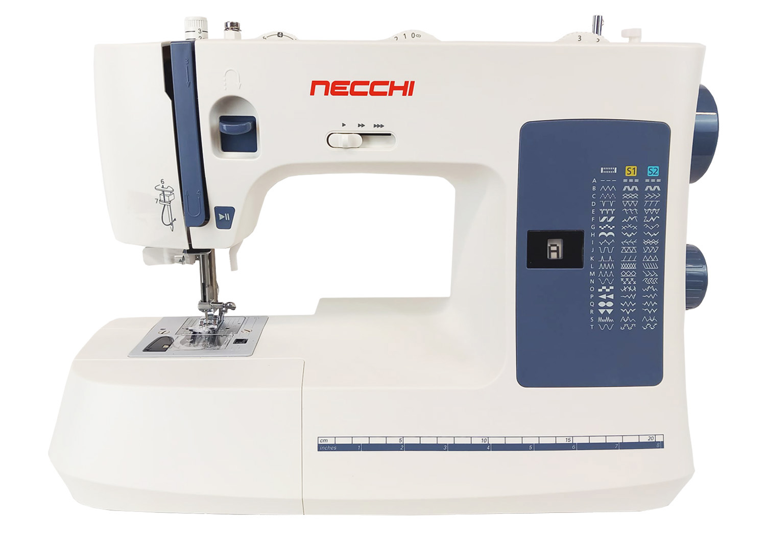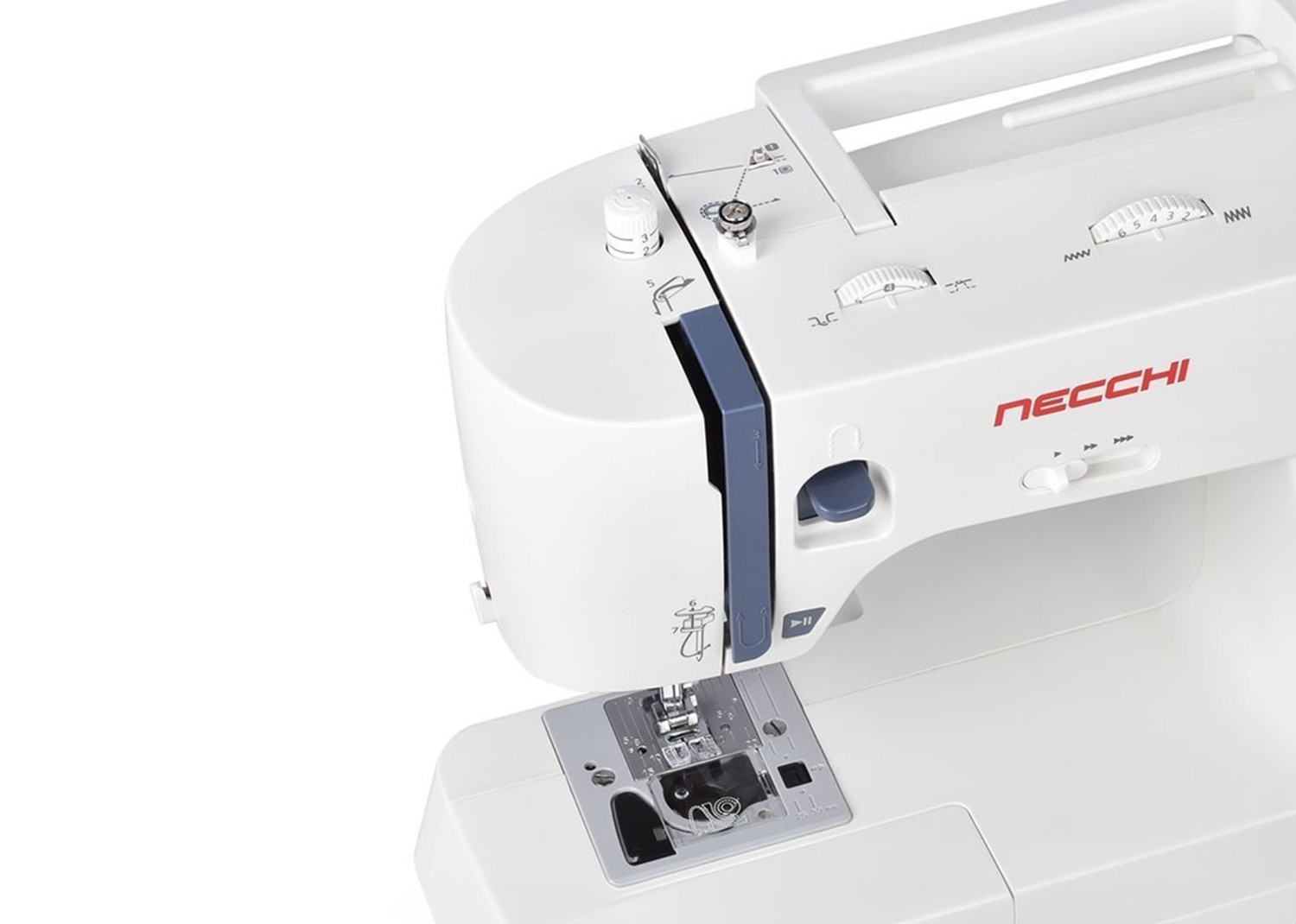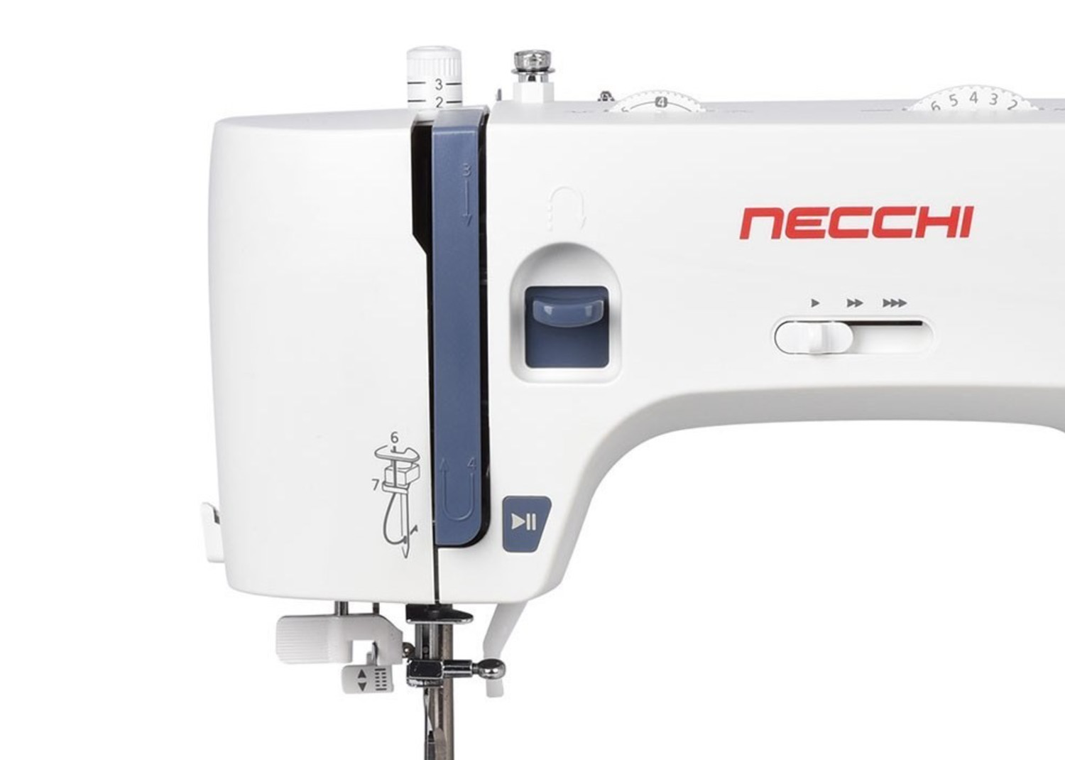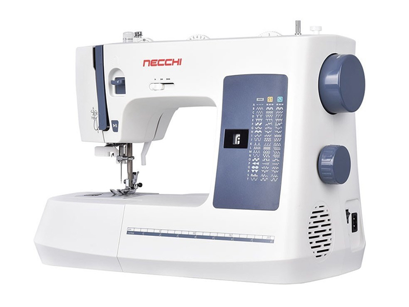 Necchi NC-59QD è caratterizzata da facilità d’uso con comode funzioni quali regolazione velocità di cucitura, pulsante start/stop, ago alto/basso attivabile attraverso il pedale di comando.