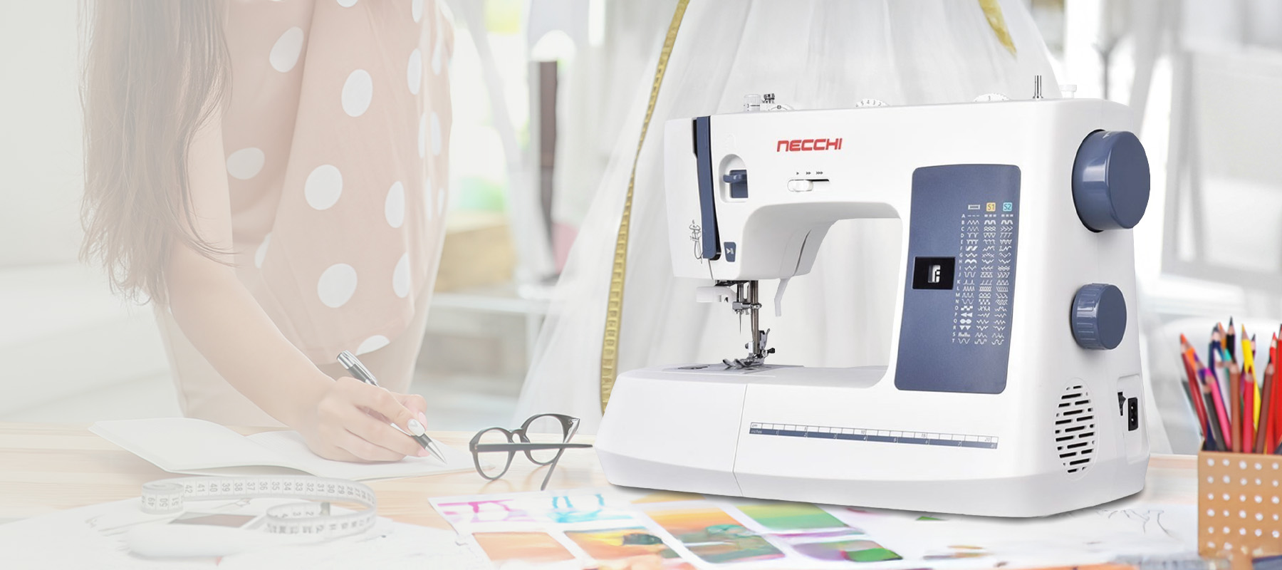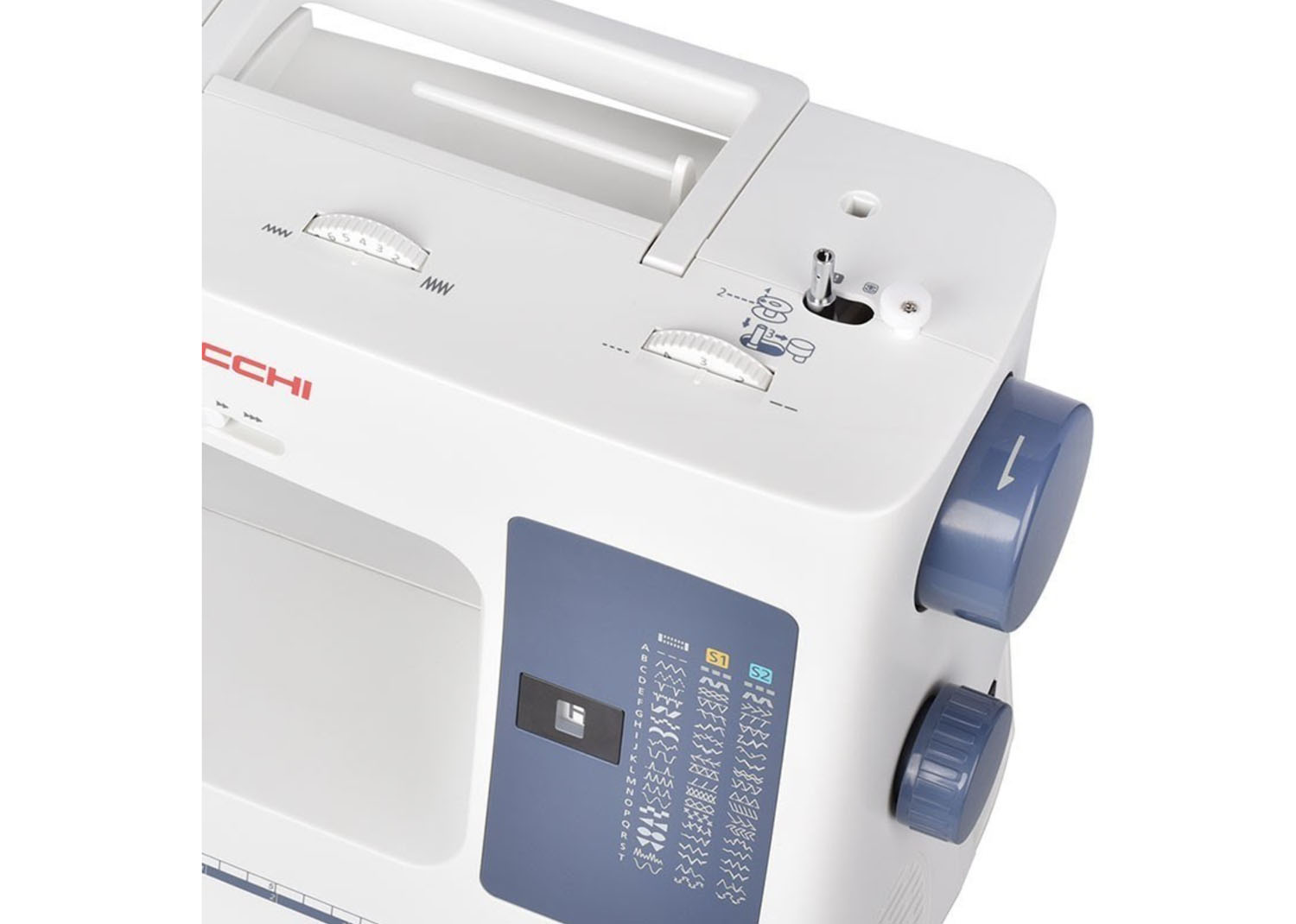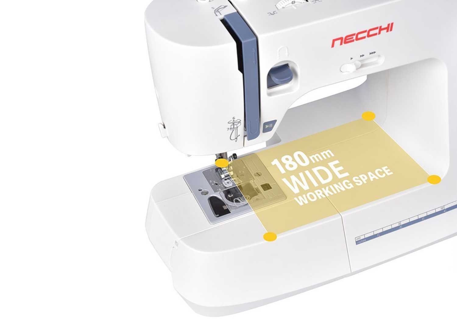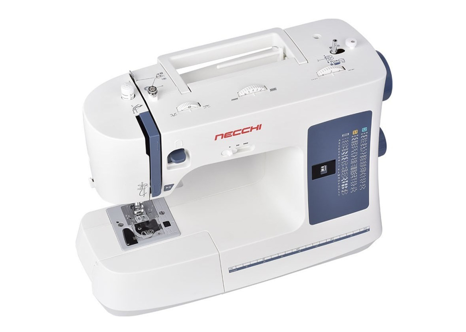 Necchi NC-59QD è caratterizzata da facilità d’uso con comode funzioni quali regolazione velocità di cucitura, pulsante start/stop, ago alto/basso attivabile attraverso il pedale di comando.